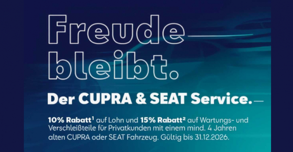 Dein CUPRA & SEAT ist mehr als ein Auto. Gönn ihm darum mal wieder den Service, den er verdient. Mit den passenden Serviceangeboten: Wenn dein CUPRA oder SEAT mindestens 4 Jahre alt ist, sicherst du dir jetzt 10% Rabatt¹ auf Lohn und 15% Rabatt² auf Wartungs- und Verschleißteile.