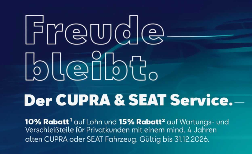 Dein CUPRA & SEAT ist mehr als ein Auto. Gönn ihm darum mal wieder den Service, den er verdient. Mit den passenden Serviceangeboten: Wenn dein CUPRA oder SEAT mindestens 4 Jahre alt ist, sicherst du dir jetzt 10% Rabatt¹ auf Lohn und 15% Rabatt² auf Wartungs- und Verschleißteile.
