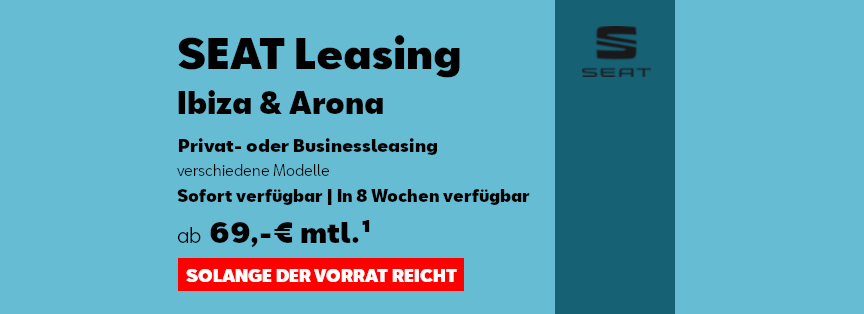 Entdecke unsere SEAT Ibiza & Arona Aktion. Wir haben attraktive SEAT Fahrzeuge für dich im Angebot - Nur solange der Vorrat reicht! Die Fahrzeuge sind sofort verfügbar bzw. in 8 Wochen verfügbar - und das zu sensationellen Konditionen.